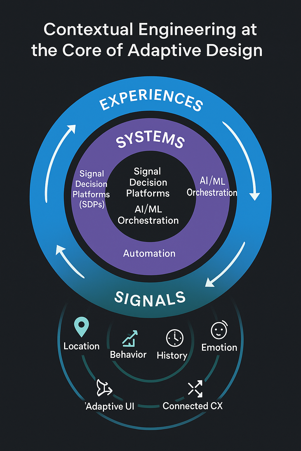 If adaptive design is the philosophy, contextual engineering is the machinery that powers it. Today, interfaces are no longer built on static logic but on signals, location, past behavior, time of day, emotional state, and even subtle cues like scrolling speed or dwell time. These signals feed into Signal Decision Platforms (SDPs), which act as real-time conductors, orchestrating how the interface responds and evolves.