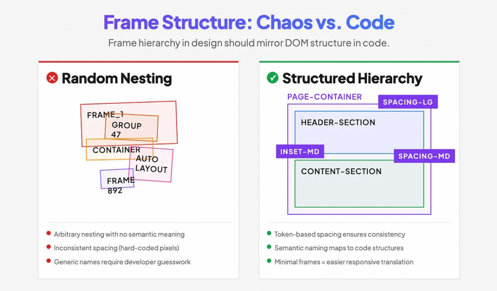 Treat frames as engineering structures from day one. A mature system will have variable spacing tokens for page sections and containers, as well as properly structured inset frames to work automatically. Respect page-level structures, reduce the number of inset frames to their minimum, name them consistently, and treat them as part of the code.