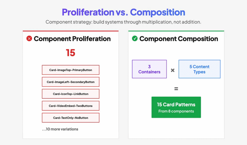 For example, one card container component with three layout variants, combined with five content-type components, creates fifteen possible card patterns. That’s fifteen solutions from five content components instead of fifteen separate components.