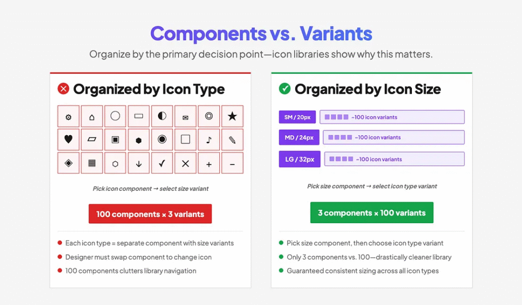 A clear example is an icon library. Rather than having ~100 icon types each in 3 sizes, have 3 size components, each with ~100 icon variants. A designer starts with an icon size (the primary decision), then chooses the type of icon (the variation). Doing the opposite — swapping a component to select an icon creates both a poor workflow and a bloated library.